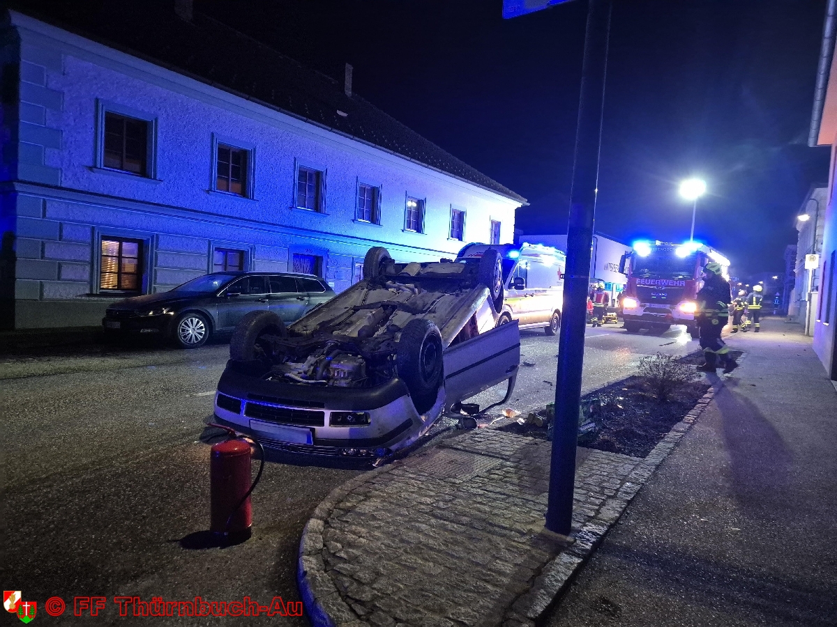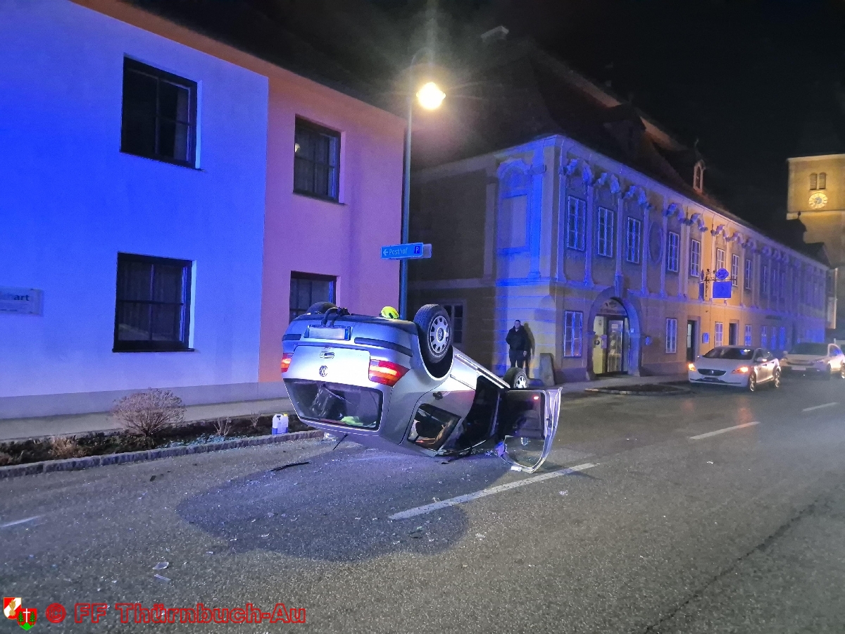 Der verunfallte PKW streifte ein parkendes Auto wodurch es durch die Wucht des Aufpralls zum Überschlag kam. Das Fahrzeug samt Person blieb am Dach liegen.