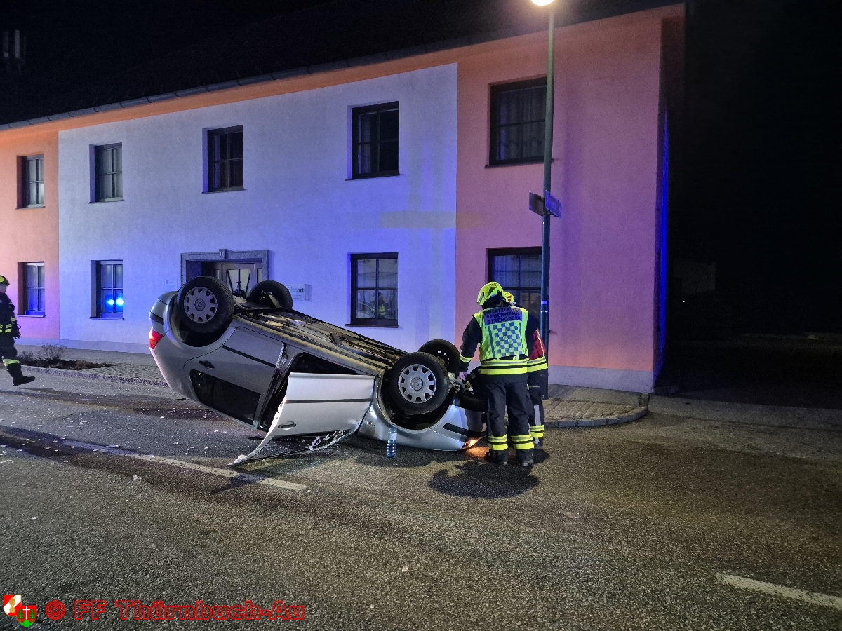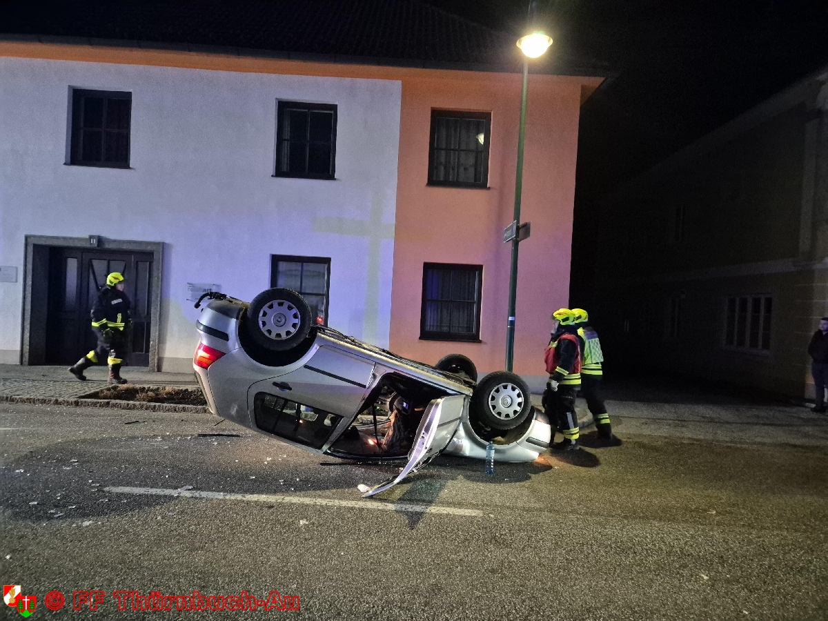Der verunfallte PKW streifte ein parkendes Auto wodurch es durch die Wucht des Aufpralls zum Überschlag kam. Das Fahrzeug samt Person blieb am Dach liegen.